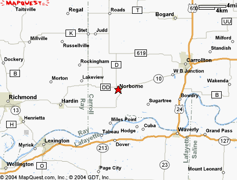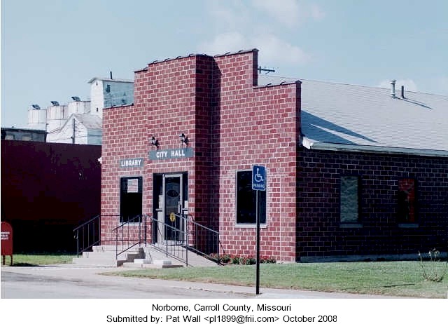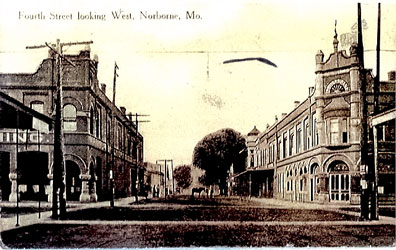 Located at the junction of 10 & DD The town was located on the south 60 acres of the E1/2 of NW1/4 Sec 23; the N1/2 of the N1/2 of the SW1/4, and the W1/2 of the NE1/4 Established in 1868, when the North Missouri Railroad was built. The first house in the town was built by Harvey McCoy and the first store was opened by January & Snoddy. The plat of the original town was filed April 8, 1874, by John Dieterich, the owner of the town site. The town was incorporated on April 20, 1874 and reorganized under a new state law in 1878 to become a city of the fourth class. Norborne was started as a railroad town. The first railroad to play an important part in the history of the area was the North Missouri. In 1862 the North Missouri was consolidated with the St. Louis, Kansas City and Northern Railroad. In 1879, another consolidation took place with the Wabash. The Santa Fe started its expansion east to Chicago in 1874 and completed the route in 1878, forming the double tracks in Norborne. (Running from Carrollton in the east to Hardin in the west.) Norborne B. Coates was born in Randolph County, the son of Captain Thomas Coates, one of the earliest pioneer families of the Randolph County area. In 1868, Mr. Coates secured the position of Land Agent and Surveyor for the North Missouri railroad. He was also a notary public (with his signature on many old abstracts in Norborne). He came to the area in 1867 to contact owners of land and start negotiations for a right-of-way for the railroad. He surveyed land owned by John and Catherine Deitrich, purchased the railroad rights, then used his shrewd business talents to help plat a town on the site. Hence the name, NORBORNE. Source: Norborne Centennial Book-1868 to 1968 |