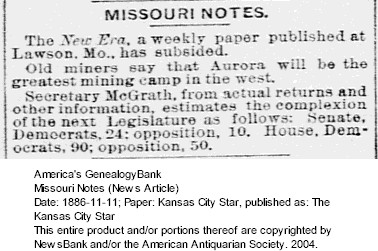 | Ray Chronicle | July 1, 1876 | microfilm at: State Historical Society of Missouri |