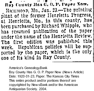 The printing plant of the former Henrietta Progress, at Henrietta, MO., in this county, has been purchased by Richard Whipple, who has resumed publication of the paper under the name of the Henrietta Review. the first editon ws published this week. Republican policies will be supported by the paper, which is the only one of its kind in Ray County. |