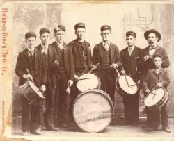 This delightful old photo is of the "Rinehart Drum Corps 1894" (as written on the drum). Click for a larger view. Photo courtesy of Georgia Charles. Can you help us identify these gentlemen or provide additional information about this drum and fife corps?