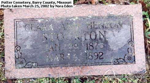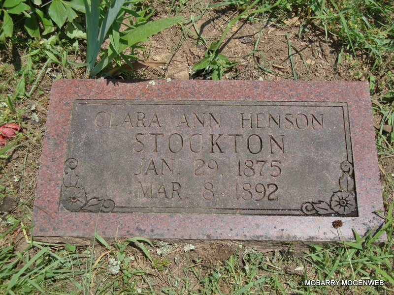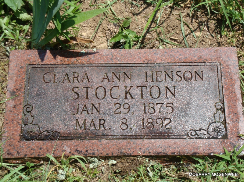 | STOCKTON, Clara Ann (HENSON) | Jan. 29, 1875 | Mar. 8, 1892 | Research Note: First wife of "Pete" Pet Stockton. Daughter of George Washington Henson and Mary Armenda Rogers. - Another Photo | Note Phyllis Long Photo Connie Schmidt Photo Nora Eden |