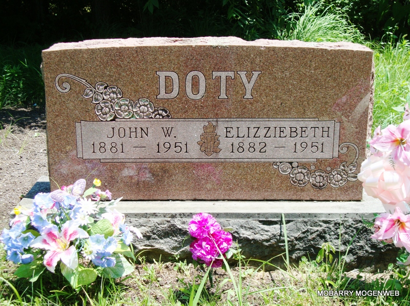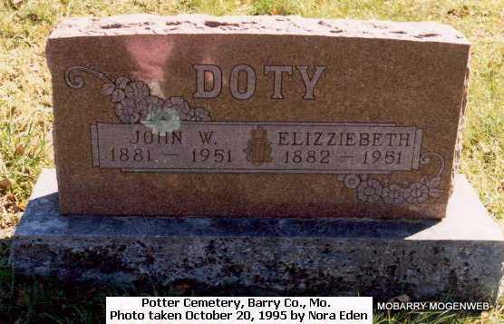SSW: John - Research Note: Wife of John W. - Her death certificate lists her name as Elizabeth and not Elizziebeth as her stone reads. Her husband was listed as John Doty and Myrtle Richardson gave the information. - Daughter of George W. Henson and Mary Armenda Rogers. J. W. Doty, age 20, married Elizzie Henson, age 19, on Dec. 31, 1901 in Barry Co., MO. - Another Photo | Death Certificate Donna Cooper MO Marriage Records Census Phyllis Long Photo Connie Schmidt Photo Nora Eden |