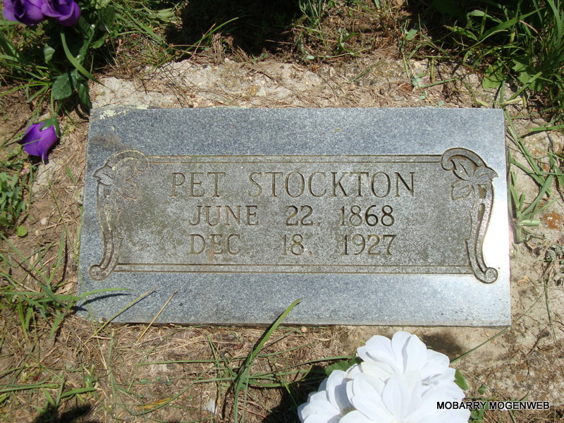 | STOCKTON, Thomas Jefferson "Pet/Pete" | June 22, 1868 | Dec. 18, 1927 | Research Note: His death certificate has a 1926 date of death. He was a farmer and a son of Jeff Stockton, born TN. His mother was Polly Short, born MO. The cause of death was Bright's Disease. James Stockton, Hailey, MO, was the informant. - Another Photo - Plot Photo | Death Certificate Donna Cooper Photos Connie Schmidt Photo Nora Eden |