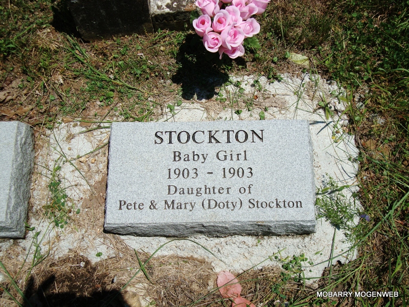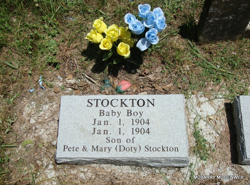 | STOCKTON, Baby Boy | Jan. 1, 1904 | Jan. 1, 1904 | Inscription: "Son of Pete and Mary (Doty) Stockton" - Research Note: May be Infant Stockton listed below with no date and note: "No Marker but known to be buried here per Mr. & Mrs. Eubanks." | Note Phyllis Long Photo Connie Schmidt |