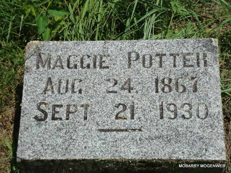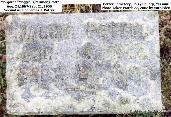 | POTTER, Margaret "Maggie" (PERIMAN) | Aug. 24, 1867 | Sept. 21, 1930 | Research Note: Second wife of James T. Potter - Funeral Home Records stated that his father was William Perriman of IL. Mother, Martha Henson. Died of myocarditis. - Another Photo - Plot Stone | King Funeral Home Jay Trace Photo Connie Schmidt Photo Nora Eden |