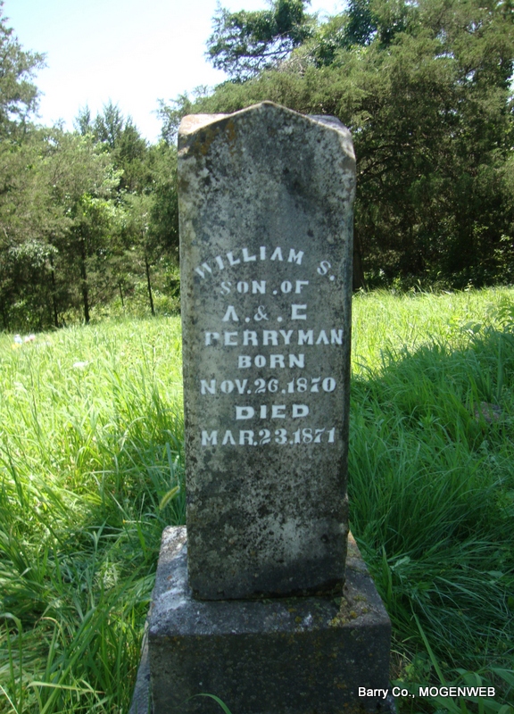 | PERRYMAN, William S. | Nov. 26, 1870 | Mar. 23, 1871 | Inscription: "Son of A. and E. Perryman" - Research Note: He was a son of Allen & Elizabeth (Short) Perryman. | Note Nora Eden |