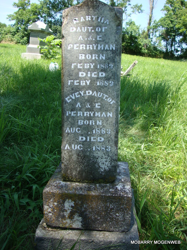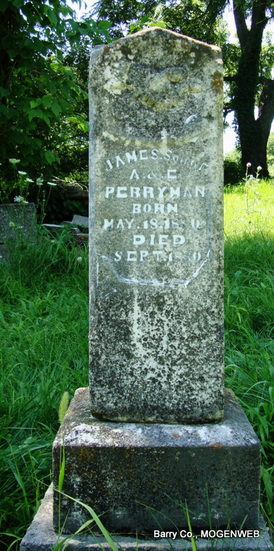 | PERRYMAN, James S. | May 18, 1880 | Sept. 18, 1880 | SSW: Martha and Evey - Inscription: "Son of A. and E. Perryman" - Research Note: He was a son of Allen & Elizabeth (Short) Perryman. - Another Photo | Note Nora Eden Photos Connie Schmidt |