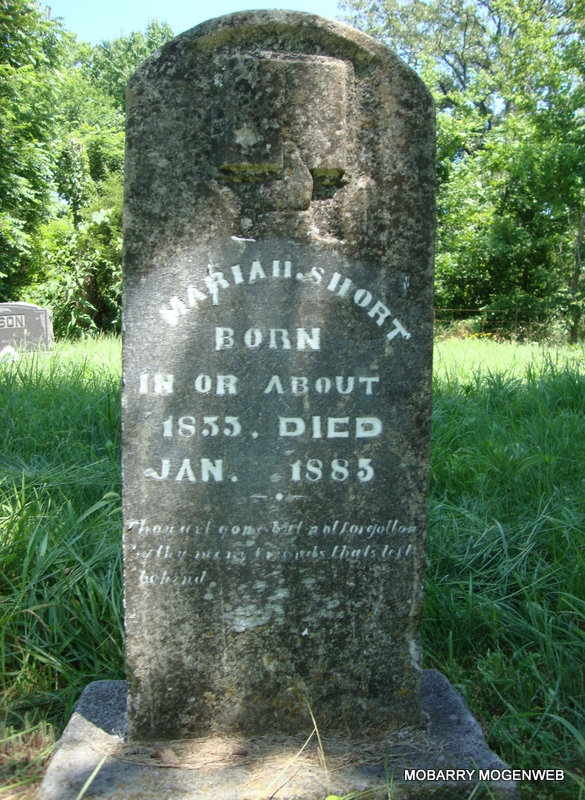 | STOCKTON, Mary Ann "Polly" (SHORT) | No Date | July 22, 1871 | Research Note: Daughter of Jonah Short and Susan Taylor. Second wife of Thomas Jefferson "Jeff" Stockton. - Connie thinks that this is Mary Ann. It is with the Short's but we had thought that she was probably buried between Jeff and Pete as there is evidence of a grave there. - Another Photo - Another Photo | Census Phyllis Long Note Photo Connie Schmidt |
