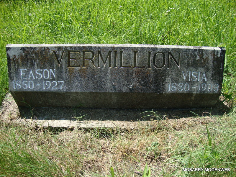 SSW: Visa - Research Note: His first wife was Visia Vermillion. Second wife was Louisa (Withers) Meador, buried at New Site Cemetery with her first husband, James Thomas Meador. His death certificate names his father as Uriah Vermillion and his mother with the maiden name of Ethridge, both born in OH. He had a brother Reason Vermillion which makes things confusing. According to death certificates for both, they were not twins. He was a retired farmer and his wife was given as Louisa Vermillion. Matilda Ethridge was his mother's name. - 1910 Census, Monett, Barry, Missouri - Eason Vermillion, head, age 59, married twice, married 3 years in this marriage, born MO; Louisa, wife, age 58, married twice, married 3 years in this marriage, born MO, mother of 8 children, 8 living. - Another Photo | Death Certificate Donna Cooper Census Phyllis Long Photo Connie Schmidt Photo Nora Eden |