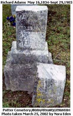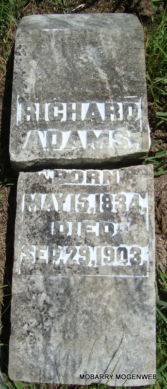 | ADAMS, Richard | May 15, 1834 | Sept. 29, 1903 | Research Note: 1900 Census, Jenkins, Barry, Missouri - Richard Adams, head, born Apr. 1833 MO, age 67, married 48 years, parents born TN, farmer; Anna, wife, born Feb. 1830 MO, age 70, married 48 years, mother of 2 children, 2 living, parents born TN. - Another Photo - Another Photo | Census Phyllis Long Photo Nora Eden Photo Connie Schmidt |