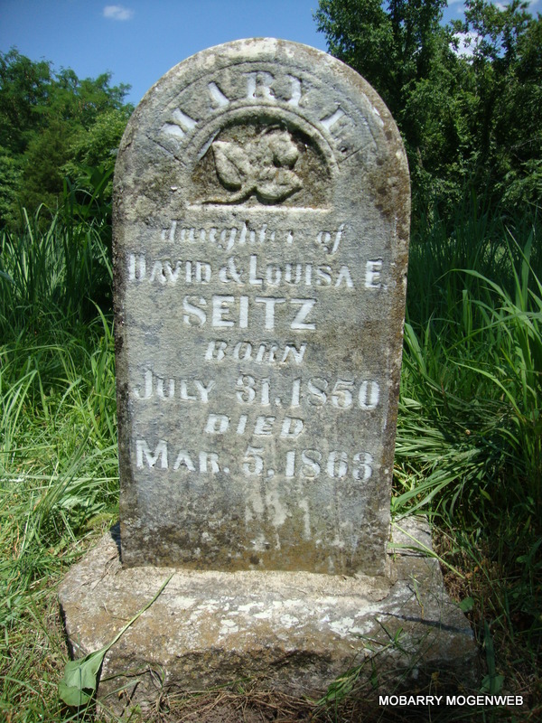 | SEITZ, Mary H. | July 31, 1850 | Mar. 5, 1863 | Inscription: "Daughter of David and Louisa E. Seitz" - Research Note: She was a daughter of David and Louisa E. (Austin) Seitz, buried at Mars Hill Cemetery. | Note Nora Eden Note Phyllis Long Photo Connie Schmidt |