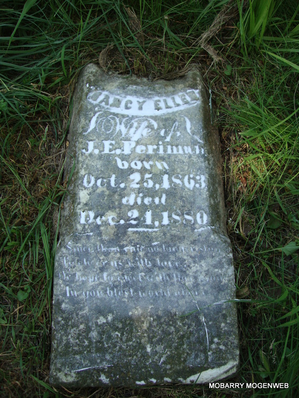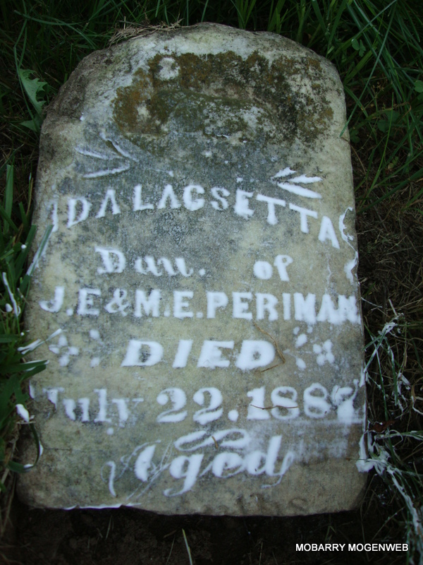 | PERRYMAN, Evey | Aug. 1883 | Aug. 1883 | Research Note: SSW: Martha and James S. - Inscription: "Daut. of A. and E. Perryman" - Research Note: She was a daughter of Allen & Elizabeth (Short) Perryman. - Another Photo | Note Nora Eden Photo Connie Schmidt |
