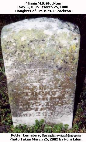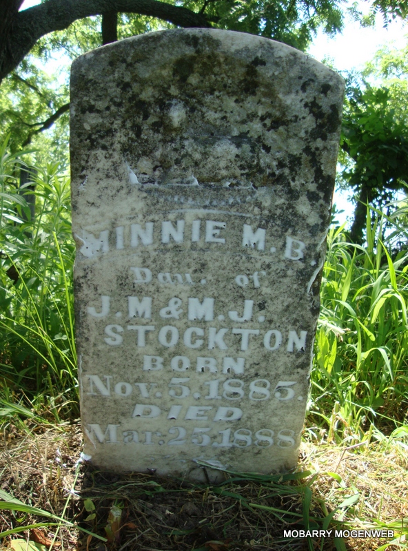 | STOCKTON, Minnie M. B. | Nov. 5, 1885 | Mar. 25, 1888 | Inscription: "Dau. of J. M. and M. J. Stockton" - Research Note: She was a daughter of Jackson Monroe Stockton and Miriah Jane Meek. - Another Photo | Photo Note Connie Schmidt Photo Nora Eden |