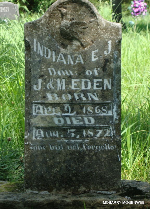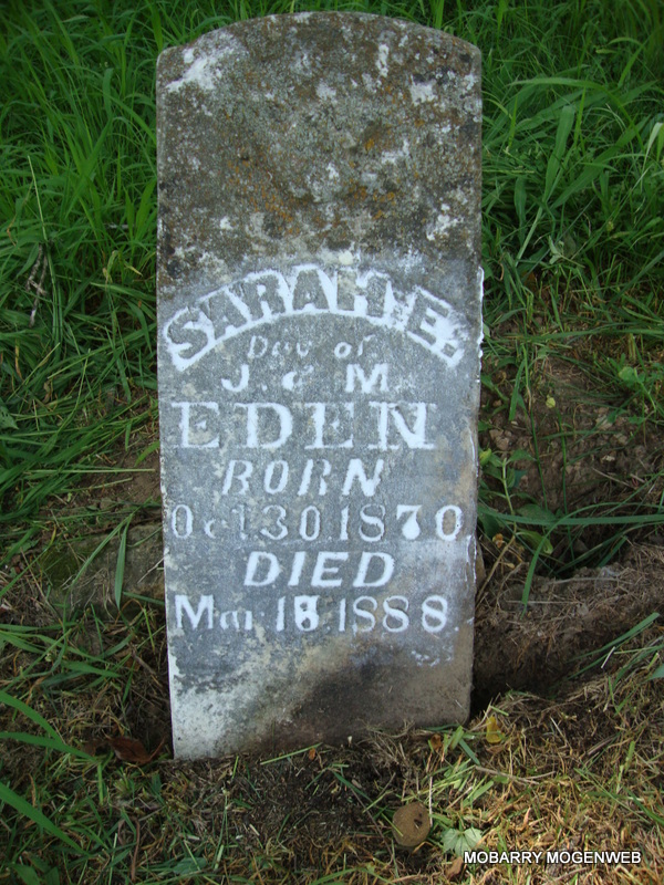 | EDEN, Sarah E. | Oct. 30, 1870 | Mar. 18, 1888 | Inscription: "Dau. of J. and M. Eden - Research Note: Daughter of Jonathan & Martilda (Stockton) Eden. Never married. | Note Nora Eden Photo Connie Schmidt |