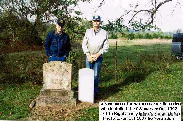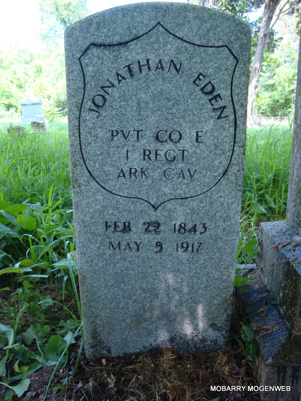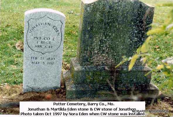 SSW: Martilda (Stockton) Eden - Research Note: Believed to be the son of Elias Eden and Edy P. Blythe. He was the husband of Martilda Stockton Eden. He was in the Missouri Home Guard Co. D. and then Union Army as a Private in Co. E, 1st Reg't. Arkansas Cavalry, Aug. 3, 1862 - June 1865. - "Flat Creek, Barry Co., MO. - Aug. 11, 1884 - Hon. W. W. Dudley, Commissioner Pensions Washington D.C. - Sir, In regard to Pension Claim of Johnathan Eden I have to state that Johnathan Eden was sounded by gunshot in left shoulder while engaged in battle on Flat Creek near Clarks Mill Barry Co. Mo about August 1st 1861. He was under command of a Capt. Charles Galloway commander of a Mo. Home Guard company. I was present with said Johnathan Eden and saw him receive said wound, and know that he was in the line of his duty. Respectfully, G. R. King" - Another Photo - Another Photo - Military Stone | Note Donna Cooper Online Civil War Records Census Phyllis Long Photos Connie Schmidt Photos Nora Eden |