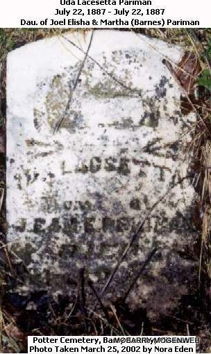 | PERIMAN, Uda Lacsetta | July 22, 1887 | July 22, 1887 | Research Note: She was a daughter of Joel Elisha & Martha E. (Barnes) Periman. - Another Photo | Photo Connie Schmidt Note Photo Nora Eden |