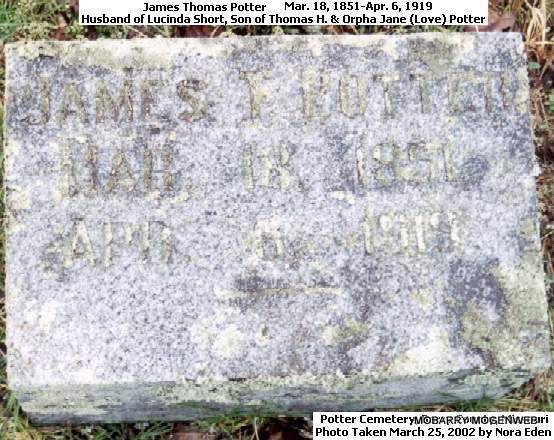 Research Note: He was a son of Thomas Hastings Potter and Orpha Jane Love, both born TN. Husband of Lucinda Short. William C. Potter of Jenkins, MO was the informant on the death certificate.- Another Photo - Plot Stone | Headstone Personal Knowledge Shirley Writer Chang Death Certificate Phyllis Long Photos Connie Schmidt Photo Nora Eden |