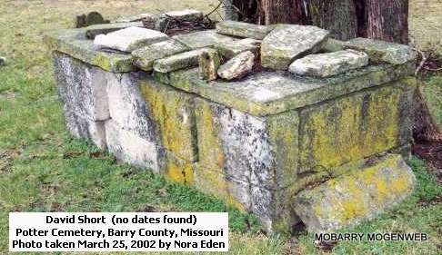 | SHORT, David | No Date | No Date | Research Note: This grave is a large box the size of a grave on top of the ground about 3 feet high. You can see between blocks that nothing is above ground. Someone just laid these blocks to look like a crypt. - Could be the son of James Short and Mary Griffith, born 1823, and brother of Jonah and Jenkins. - Another Photo - Another Photo | Note Photo Nora Eden Note Phyllis Long Photos Connie Schmidt |