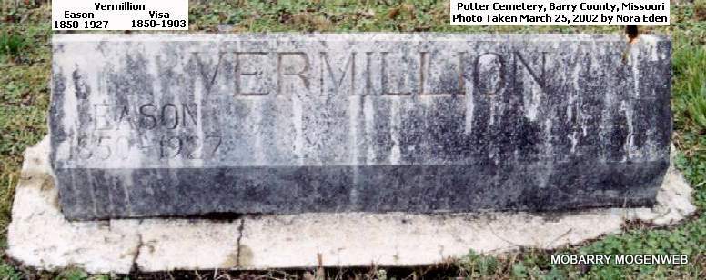 | VERMILLION, Visia | Sept. 1850 | 1903 | SSW: Eason - Research Note: First wife of Eason. - 1850 Census, Capps Creek, Barry, Missouri - Eason Vermillion, age 29, born MO, father born IL, mother TN; Livisa, age 29, wife, born MO, parents born MO. - 1900 Census, Jenkins, Barry, Missouri - Eason Vermillion, head, born June 1850, MO, age 49, married at age 27; Levisa, wife, born Sept. 1850 MO, age 49, married at age 27; John C., cousin, born Jan. 1883 TX, age 17, farm hand. | Census Phyllis Long Photo Connie Schmidt Photo Nora Eden |