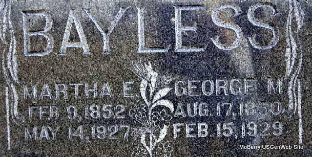 SSW: Martha E. - Inscription: "At Rest" - Research Note: According to his death certificate his father was named John Howard Bayless, born in AL, and his mother was named Lurana Jane, born in AL. It reads that he was born on the 18th and not the 17th as his stone reads. Cam McCary gave the information. - Judy's Note: His mother's maiden name was Jones. His parents are buried at Vineyard Cemetery. - Cassville Democrat Feb. 22, 1929 - UNCLE GEORGE BAYLESS DIES SUDDENLY AT EXETER FRIDAY - George Martin Bayless died at the home of his daughter - in - law, Mrs. Myrtle Bayless in Exeter, last Friday night, Feb. 15, at the age of 78 years, 5 months and 29 days. He retired for the night, feeling as well as usual but soon after retiring his daughter - in - law heard him making an unusual noise. Upon going to his bed she found him in an unconscious condition from which he did not revive. He only lived a few minutes after being found. George Martin Bayless was born August 17, 1850 in Alabama. He was the son of John and Lurana Bayless being the youngest of eleven children, all of the others precede him in death. In October 1869, he was married to Martha Stephens, who preceded him in death two years ago. To their union three children were born, two daughters, Mrs. Emma McNally and Mrs. Birdie McCary, both of Exeter, Mo., one son Polk Bayless who preceded him in death two years ago. He was converted almost fifty years ago at the Old Antioch church, three miles northeast of Exeter, and united with that church at that time and has been a true and faithful member since. He has been in failing health for about six months, and has always borne his sickness with patience and fortitude. He loved a true Christian life and has always been a true husband and father to his family, and was dearly loved by all who knew him. He leaves to mourn his death, two daughters, seven grandchildren and thirteen great - grandchildren and a host of friends and relatives. Funeral Services were conducted at the Antioch church on Sunday afternoon by Rev. C.M. Smith and Charles Vanzandt. His body was laid to rest by the side of his wife in the Antioch cemetery. | Family Knowledge Judy Wilson Death Certificate Donna Cooper Online Obit Phyllis Long Photo Darla Marbut |