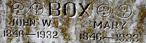SSW: John W. Box - Inscription "Gone But Not Forgotten" - Research Note: Her husband was John Box. She was 85 years, 6 months, and 18 days old when she died according to the death certificate. Father given only as Depew. Frank Dilbeck of Cassville, MO was the informant. Mary E. Depue/Depew married John W. Box on July 11, 1868 in Dade Co., MO. Daughter of George Depew and Matilda Buckner. | Death Certificate Census Phyllis Long Photo Darla Marbut |