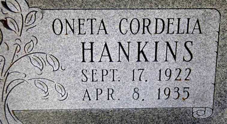 | HANKINS, Oneta Cordelia | Sept. 17, 1922 | Apr. 8, 1935 | Research Note: Daughter of Golden Arthur Hankins and Cordelia C. Vineyard. | Census Phyllis Long Photo Darla Marbut |