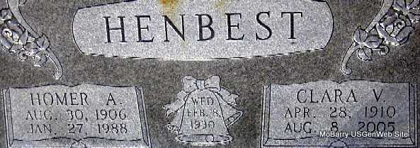| HENBEST, Homer Alfred | Aug. 30, 1906 | Jan. 27, 1988 | SSW: Clara V. Henbest - Inscription: "Wed - Feb. 8, 1930" - Research Note: Son of William Henry Henbest and Ocie Ball. | Census Phyllis Long Photo Darla Marbut |