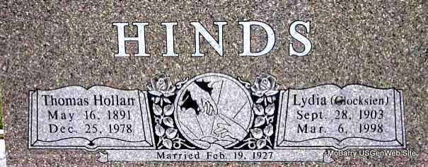 | HINDS, Lydia Cordelia (GLOCKSIEN) | Sept. 28, 1903 | Mar. 6, 1998 | SSW: Thomas Hollan Hinds - "Married Feb. 19, 1927" - Research Note: Lydia Glocksien, age 23 of Eureka Springs, Carroll Co., AR, married Thomas Hinds, age 35 of Clifty, Madison Co., AR, on Feb. 19, 1927 in Carroll Co., AR. Daughter of Dan Frederick Glocksien and Sarah Evaline Scates. | AR Marriage Index Census Phyllis Long Photo Darla Marbut |
