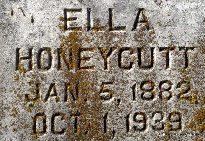 Research Note: According to her death certificate, Mary Ella's father was Sexton P. McGruder born in Bullett Co., KY, and her mother was Minerva E. Burba, born Bullett Co., KY, and her husband was listed as Eliga Honeycutt. She died from the effects of breast cancer. H. F. McGruder, Wayne, MO, was the informant. - 1920 Census, Flat Creek, Barry, Missouri - She is listed as Ellie Honeycutt, age 38, born KY, widowed and living with her parents. | Death Certificate Donna Cooper Census Phyllis Long Photo Darla Marbut |