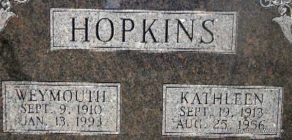 | HOPKINS, Weymouth K. | Sept. 9, 1910 | Jan. 13, 1993 | SSW: Kathleen - Research Note: SSDI gives his last address as Rogers, Benton Co., AR. Son of John Hopkins and Ida Dunn. Weymouth K. Hopkins, age 57, second married Elma M. Castleman, age 53, on Apr. 6, 1968 in Kansas City, Jackson Co., MO. | MO Marriage Record SSDI Census Phyllis Long Photo Darla Marbut |