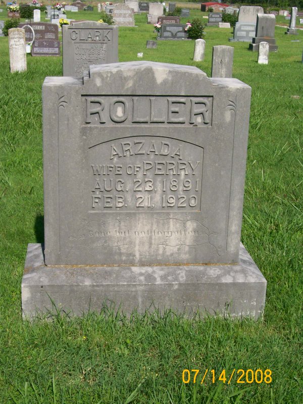 | ROLLER, Arzada (WHITTINGTON) | Aug. 23, 1891 | Feb. 21, 1920 | Inscription: "Wife of Perry" - Research Note: She was a daughter of Francis Sigel and Mary Ann (Riddle) Whittington. - Cassville Republican, Feb. 28, 1920 - Miss Arzada Whittington was born Aug. 23, 1891, on Gunter Creek in McDonald township, a few miles northeast of Butterfield, and was a daughter of Mr. and Mrs. Sig Whittington and had lived all her life in this county. On Aug. 14, 1911, she and Perry Roller of the same section of county were married and four children were born of this marriage, three surviving the mother. Her husband, father, mother, one brother, three sisters, a host of relatives and friends also survive her. She was converted at age of 14 years and united with the Baptist Church at Pleasant Grove and lived a devoted and zealous Christian life. She died Feb. 21,1920 of flu pneumonia, aged 27 years, 5 months and 28 days. - Another Photo | Note Donna Cooper Online Obit Phyllis Long Photo Lyle Bethune Photo Jay Trace |