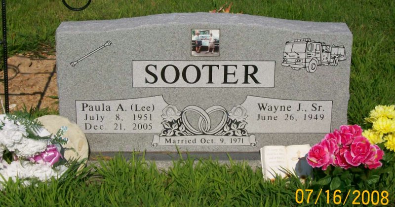 SSW: Wayne J. - Inscription: "Married Oct. 9, 1971" - Paula Annette Sooter, 54, of Pierce City, died December 21, 2005 at her home. She was born July 8, 1951, in Anderson. She was a 1969 graduate of Monett High School where she was a baton twirler. She was a member of the First Baptist Church in Pierce City. She was raised by Mr. and Mrs. Homer Lee. She married Wayne Sooter on October 9, 1971, in Monett. She was preceded in death by her mother, Joyce (Porter) Rowe. - Photo on Stone | Monett Times Donna Cooper Photos Jay Trace |