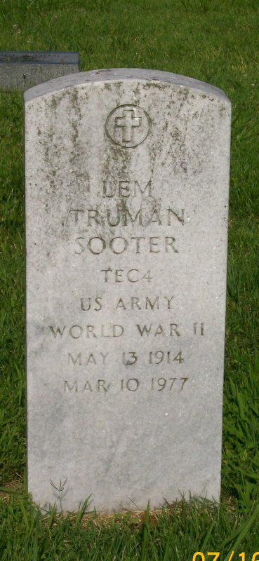 | SOOTER, Lem Truman | May 13, 1914 | Mar. 10, 1977 | Inscription: "TEC 4 U S ARMY WORLD - WAR II" - Research Note: Son of Calvin Asher Sooter and Martha Jane McCoy. He married Miss Grubbs. | Census Phyllis Long Headstone Teresa Chardoul Photo Jay Trace |