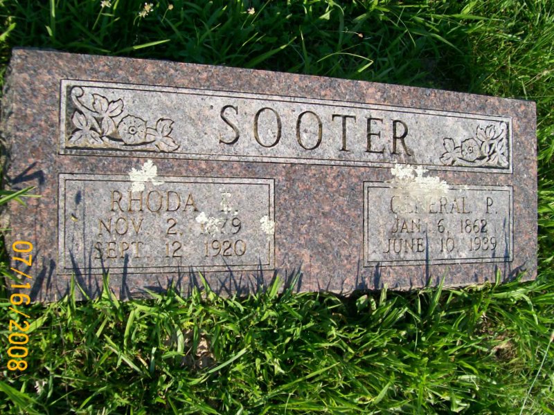 SSW: Rhoda - Research Note: Obit: General P. Sooter, 77, Dies Here Saturday. General P. Sooter, 77, of 1428 W. Admiral Blvd., died at a Tulsa Hospital Sat. from a complication of diseases attributed to his age. The body will be sent to Purdy, MO, for funeral and burial. He leaves three sons: J. M. Sooter, Tillman Sooter, and Howard Sooter, all of Tulsa; five daughters: Mrs. Frona Briggs, Reeds, MO, Mrs. Lorene Clapp, Mrs. Pearl Woodward, Mrs. Leona Wright and Mrs. Goldie Stanbaugh. - Son of Benjamin Franklin Sooter and Margaret T. Smith Margaret second married James H. Coatney and is buried at Corsicana Cemetery with James. Benjamin was a Civil War Veteran and may have died in the war. | Headstone Teresa Chardoul Ancestry.com Obit Phyllis Long Photo Jay Trace |