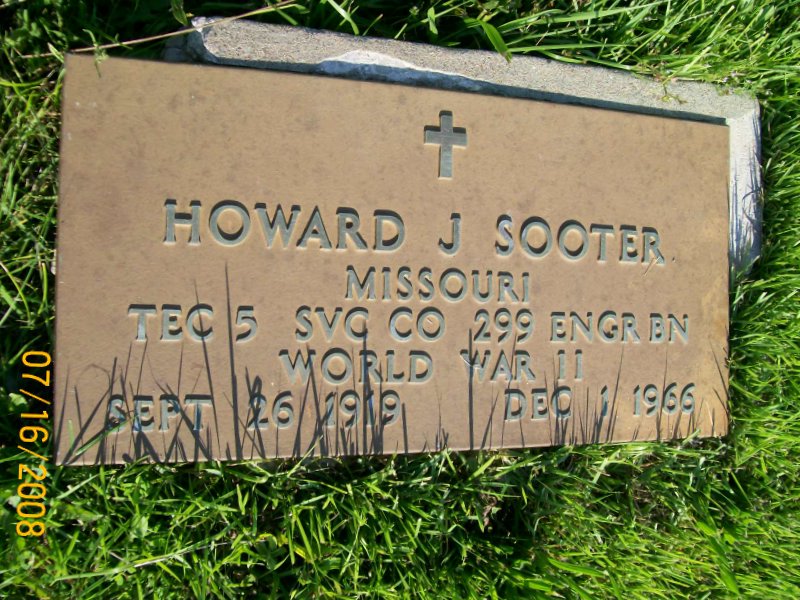 Inscription: "Missouri, TEC 5 SVC CO 299 ENGR BN - WORLD WAR II" - Research Note: Son of General Price Sooter and Rhoda Bayless. | Headstone Teresa Chardoul Census Phyllis Long Photo Jay Trace |