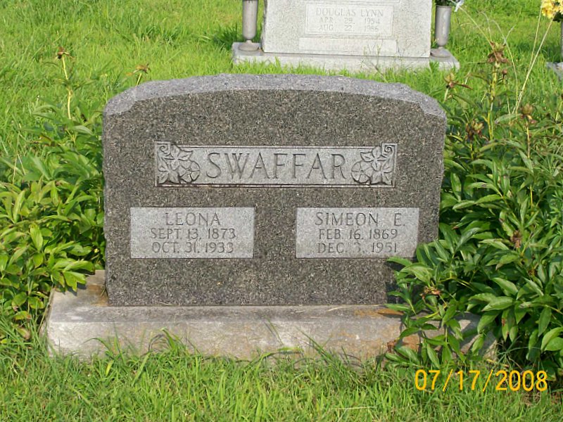 SSW: Leona - Research Note: His death certificate reads that he was widowed and that his wife's name was Leona Swaffar. He was a retired farmer. His usual address was 612 Central, Monett, MO. The cause of death is given as cancer of the stomach. His father was named Benjamin Larkin Swaffar and his mother was given as Mary Jane Tomlinson. Katherine Henderson, Monett, MO, was the informant and she is buried next to Simeon and Leona. | Death Certificate Donna Cooper Photo Jay Trace |