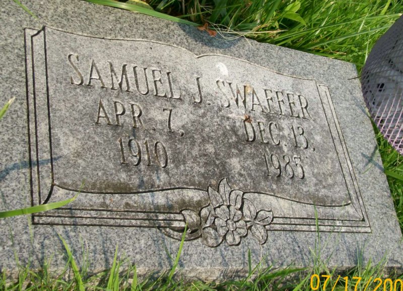 | SWAFFAR, Samuel Jefferson | Apr. 7, 1910 | Dec. 13, 1985 | Research Note: He is buried next to Simeon and Leona (Bingham) Swaffar, his parents, and near Katherine (Swaffar) Henderson, his sister. His wife was Georgia Emma Henderson. | Census Daughter Virginia's Obit Phyllis Long Photo Jay Trace |