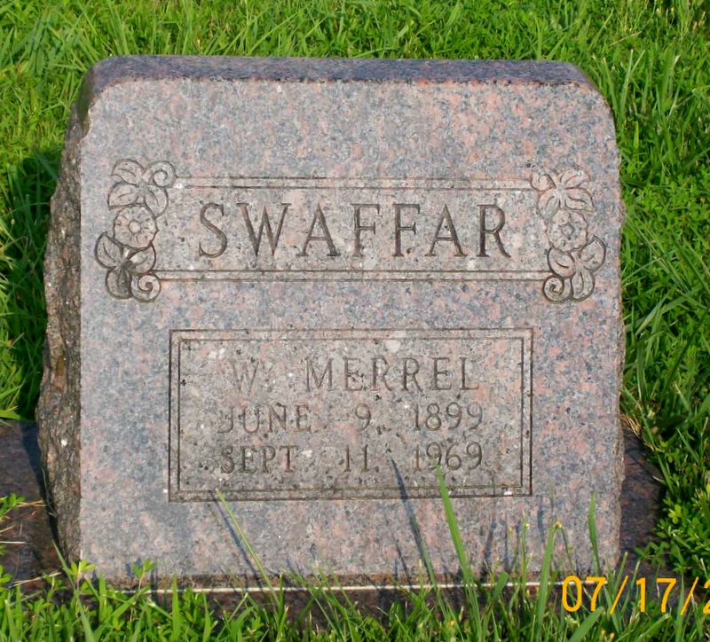 Research Note: Joplin, MO resident. Son of Thomas Jefferson Swaffar and Adelia Gilespie Liner. He was a street car operator. He first married Lauretta Norton. William Merrel Swaffar, age 65, second married Ada Whittington, age 64, on Jan. 11, 1966 in Monett, Barry Co., MO. Ada was the informant on the death certificate. | Census MO Marriage Records Death Certificate Phyllis Long Photo Jay Trace |