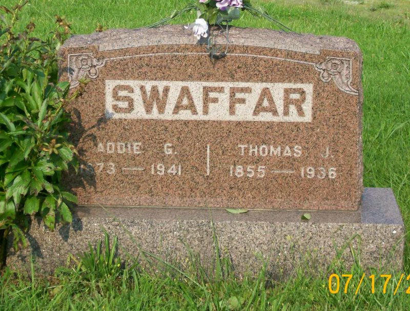 SSW: Addie G. - Research Note: His death certificate reads that Tom Swaffar, born in TN, was his father. His mother was listed as Elmire Liner, born VA. Addie Swaffar was given as his wife. His first wife was Isabelle Hemphill. - Ancestry.com Obit: Thomas J. Swaffar died Feb. 18, 1936 at Purdy, MO, of a complication caused by a fall on the ice Feb. 1. His age was 80 years, six months and two days. He was born Aug. 16, 1855, near Calhoun, TN, moved to Barry Co, MO in 1874 and has lived in and around Purdy for 52 years. At the age of 26 years he married Isabelle Hemphill at Calhoun, TN. To this union four children were born, of which three survive: Arthur Boyd and Thomas Neil of Purdy, Mrs. Myrtle Belle Bradley of Cassville, MO. Etta deceased in infancy. The wife deceased in 1889. In the year 1891 he was married to Adelia G. Liner of Brightwater, AR. To this union twelve children were born, of which eleven survive. Herbert Edward deceased in infancy. Those surviving: Mrs. Anna Lee Shaw of Bellflower, CA; Benjamin A. of Lomita, CA; James S. of Purdy; William Merrel of Minden Mines, MO; Porter Dewitt of Purdy; John C. of Purdy; Joseph Howard of Bellflower, CA; Oswald Maynard of Wilmington, CA; Mrs. Almira E. Shepherd of Purdy; Ornan B. and Mary Ella of the home. He leaves his widow, 14 children, 31 grandchildren, seven great grandchildren and a host of relatives and friends to mourn his passing. Funeral service was conducted at the Arnhart church by Elders C. M. Smith and Windord Davis. Interment in the Arnhart Cemetery. | Death Certificate Donna Cooper Obit Phyllis Long Photo Jay Trace |