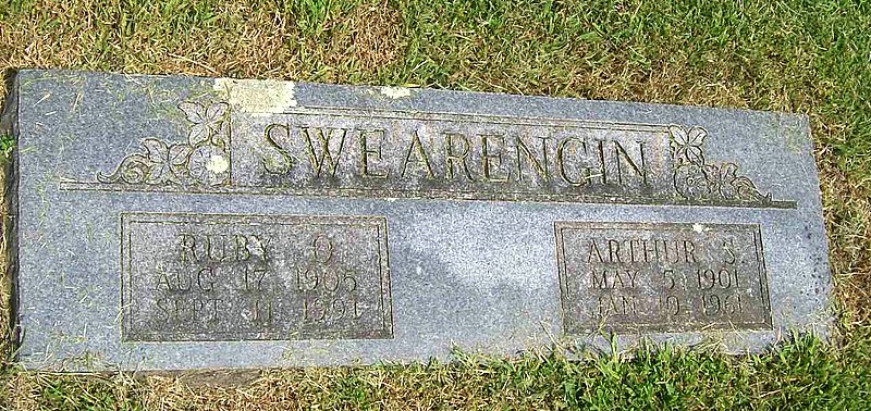 | SWEARENGIN, Ruby O. (LOWERY) | Aug. 17, 1905 | Sept. 11, 1991 | SSW: Arthur S. - Research Note: Daughter of George W. Lowery and Josephine Mary McPhail, both buried at Arnhart Cemetery. - 1930 Census, McDonald, Barry, Missouri, Ruby is, age 34, single and living with her widowed father George. | Census Phyllis Long Photo Jay Trace |