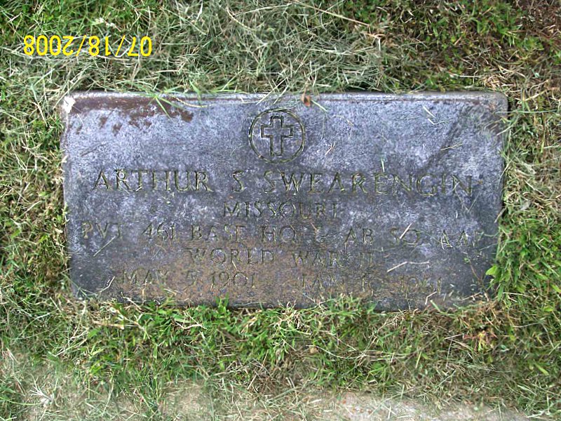 | SWEARENGIN, Arthur Samuel | May 5, 1901 | Jan. 10, 1961 | SSW: Ruby O. - Research Note: Arthur inducted in the Army on Aug. 21, 1942 and was honorably discharged on Mar. 15, 1943. His wife, Opal, applied for the military stone and it was shipped to Frank George Lowery, Rural Monett, MO. He first married Eva L. Pentico. In the 1930 Census, they are in Hadar, Pierce, Nebraska, no children. 1940 Census, Arthur is in Port Gamble, Kitsap, Washington and divorced. Second married Ruby O. Lowery. Son of Benjamin Samuel Swearengin and Sarah Ann Brashears. - Military Stone - Inscription: "MISSOURI PVT 461 BASE HQ E AB SO AA WORLD WAR II" | Military Headstone App. Census Phyllis Long Photos Jay Trace |
