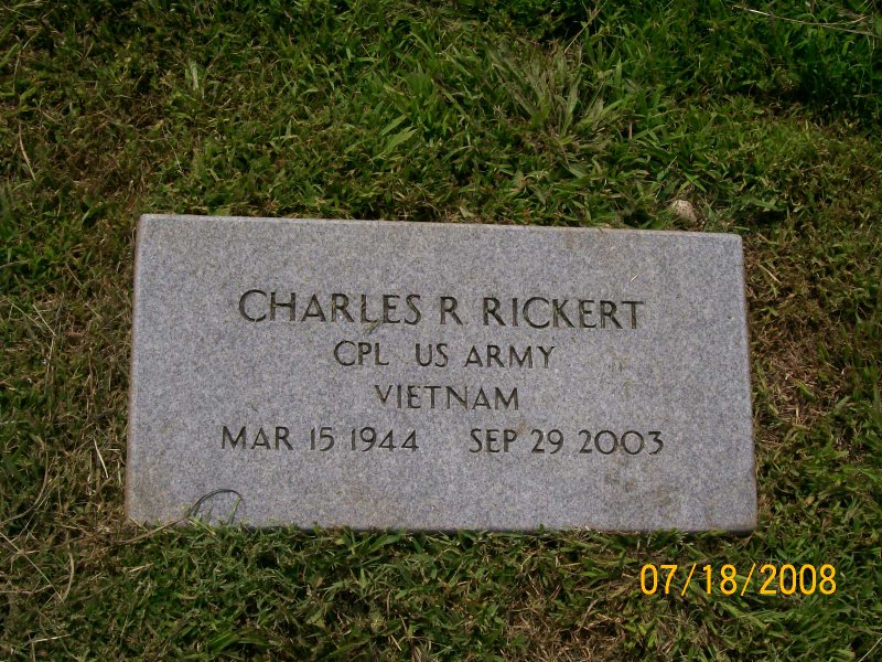 SSW: Connie J. - Inscription: "July 17, 1979" - Research Note: Charles, age 24, married Autie Ruth Atkins, age 28, on May 13, 1968 in Palo Pinto Co., TX and was divorced on Dec. 12, 1968 in Palo Pinto Co., TX, no children. He second married Connie J. - He was the son of Charles L. and Mabel I. (Glover) Rickert. He moved to Purdy from Graham, Texas, five years ago. He was a retired Army veteran, a lifetime member of the Tom Wolfe Memorial Post #4207 Veterans of Foreign Wars, and the Disabled Army Veterans. He was a past Post Commander of the Veterans of Foreign Wars Post #8567 Graham, Texas, and past District 15 Commander Department of Texas. - Military Stone -Inscription: "CPL US ARMY VIETNAM" | TX Marriage Index TX Divorce Index findagrave.com Obit Phyllis Long Photos Jay Trace |