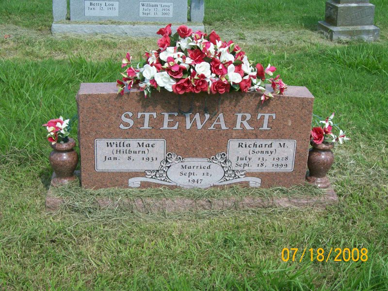 SSW: Richard M. "Sonny" - Inscription: "Married Sep. 12, 1947" - Research Note: Daughter of Oscar Cleo and Grace Samantha (Beck) Hilburn. Willa's dash is complete on earth. A beautiful milestone with ninety-four years of blessings, life experiences and so much love! She was a woman of tremendous faith in Jesus Christ as her Lord and Savior. It must be amazing for her to see our Lord's face and her husband, children and loved ones again. Also, getting to meet those too precious for this earth. She taught Sunday School and Vacation Bible School for decades. She led the Woman's Missionary Union attending the 100th Anniversary in Richmond, VA and took mission trips including, Nebraska and Alaska. She loved gardening, both vegetables and flowers, but had special pride in her many varieties and colors of flowers. She enjoyed watching birds of all kinds from the hummingbirds and woodpeckers and especially loved her cardinals. On Sep. 12, 1947, in Cassville, MO, Willa Mae Hilburn married Richard M. Stewart, and they enjoyed fifty-two years of memories together before his passing. Willa is survived by her son, Rick Stewart and wife Mary Ann, of Purdy, MO; three daughters, Connie Rickert of Purdy and Patricia Wentling and husband Kirk of Spring Hill, FL and Brenda Lee and husband Doug of North Platte, NE; sixteen grandchildren, twenty-nine great-grandchildren and ten great-great-grandchildren. Preceding her in death were her husband, Richard M. Stewart; one son, Robert Stewart; one daughter, Margaret Miller; one brother, Virgil Hilburn; three sisters, Ruby Keene, Mary Boyd and Betty Moller. | Buchanan Funeral Home L. Pearce Findagrave Census Photos Jay Trace |