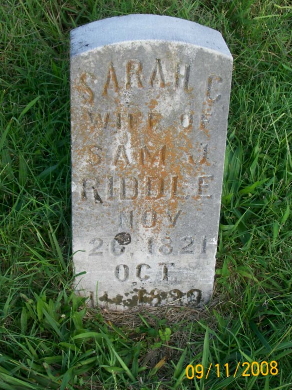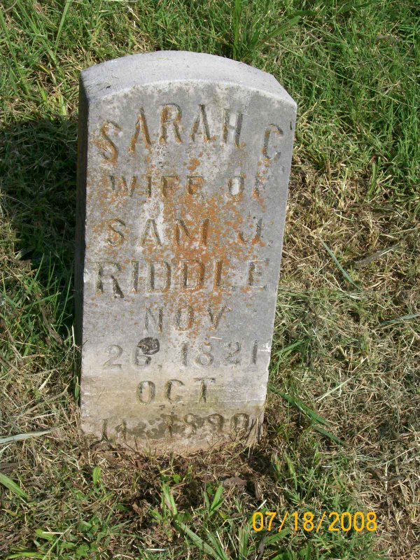 | RIDDLE, Sarah C. (DRAKE) | Nov. 26, 1821 | Oct. 11, 1890 | Inscription: "Sarah C., Wife of Sam. J. Riddle" - Research Note: Row 8 - South Side - Sarah Drake married Samuel J. Riddle, married on Aug. 17, 1841 in McMinn Co., TN. - Another Photo | TN marriage Records Phyllis Long Headstone Keith Owens Photos Jay Trace |