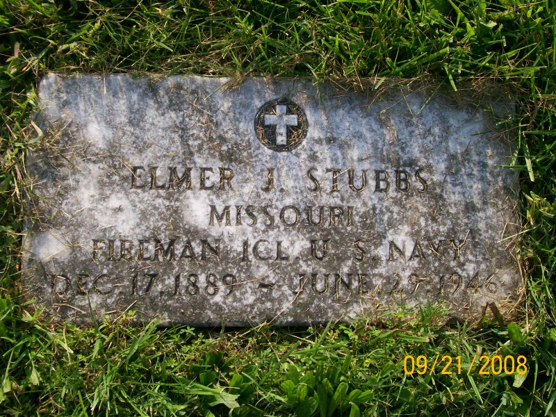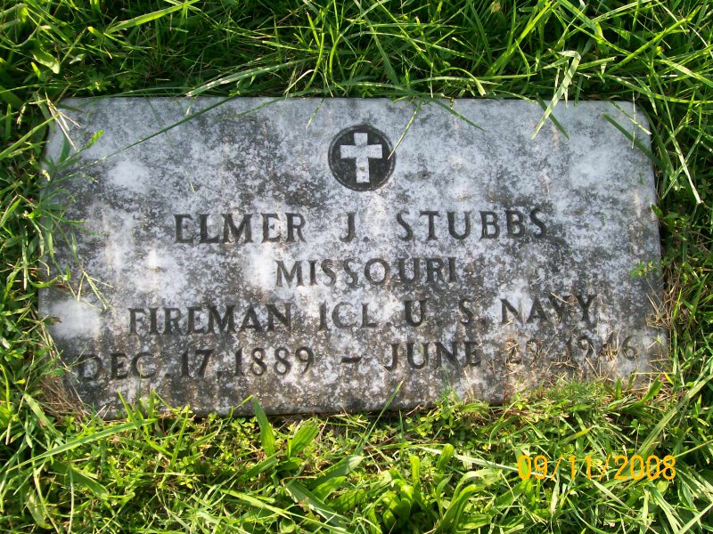 | STUBBS, Elmer J. | Dec. 17, 1889 | June 29, 1946 | SSW: John D. and Lula E. (Gates) Stubbs - Research Note: Son of Marshall D. Stubbs and Manarra Z. "Norry" Weatherman. - Military Stone - Military Stone - Inscription: "ELMER J. STUBBS - MISSOURI FIREMAN ICL US NAVY" | Census Phyllis Long Photos Jay Trace |