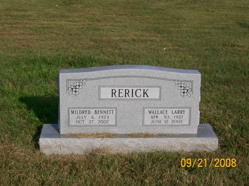 SSW: Wallace Larry - Research Note: Mildred L. (Bennett) Rerick, passed away Saturday, Oct. 27, 2007, at Cox Monett Hospital, Monett. She was born July 6, 1923, in Purdy, and was a daughter of Ralph and Mary Jewell (Hankins) Bennett. She married Wallace Larry Rerick on Jan. 6, 1983, in Cleveland, Ohio. He preceded her in death June 12, 2002. She worked as a personnel manager for the Civil Service and was a member of the First Baptist Church in Monett. | Cassville Democrat Nov. 7, 2007 Donna Cooper Photo Jay Trace |