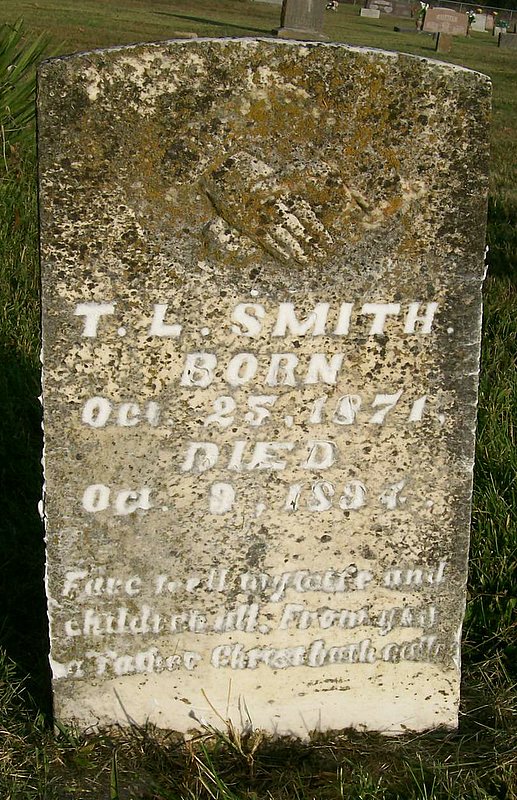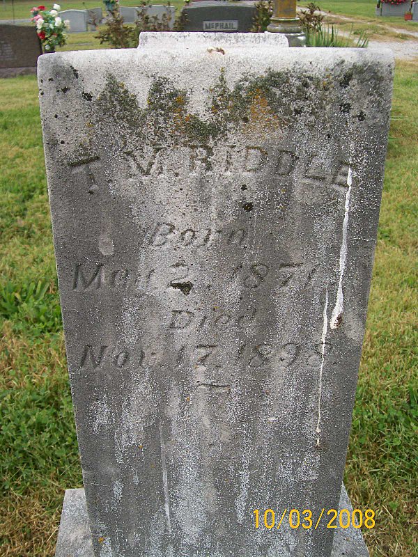 | RIDDLE, Thomas M. | May 2, 1871 | Nov. 17, 1898 | Research Note: Row 8 - South Side - He was the son of John Wesley Riddle and Elizabeth Terry. Thomas M. Riddle, age 22, married Ollie Marshall, age 19, on Nov. 26, 1893 in Barry Co., MO. - Another Photo | MO Marriage Records Census Phyllis Long Headstone Keith Owens Photo Jay Trace |