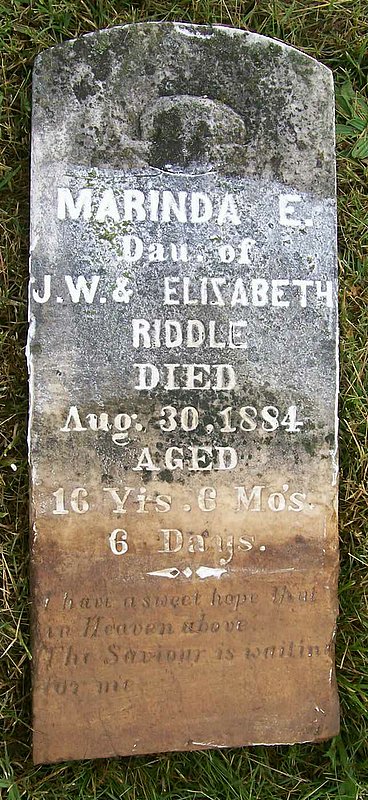 | RIDDLE, Marinda E. | 1868 | Aug. 30, 1884 | Inscription: "Marinda E. - Dau. of J. W. and Elizabeth - Aged 16 Yrs. 6 Mo's 6 Days" - Research Note: Row 8 - South Side - Daughter of John Wesley Riddle and Elizabeth Terry. - Another Photo | Census Phyllis Long Headstone Keith Owens Photos Jay Trace |