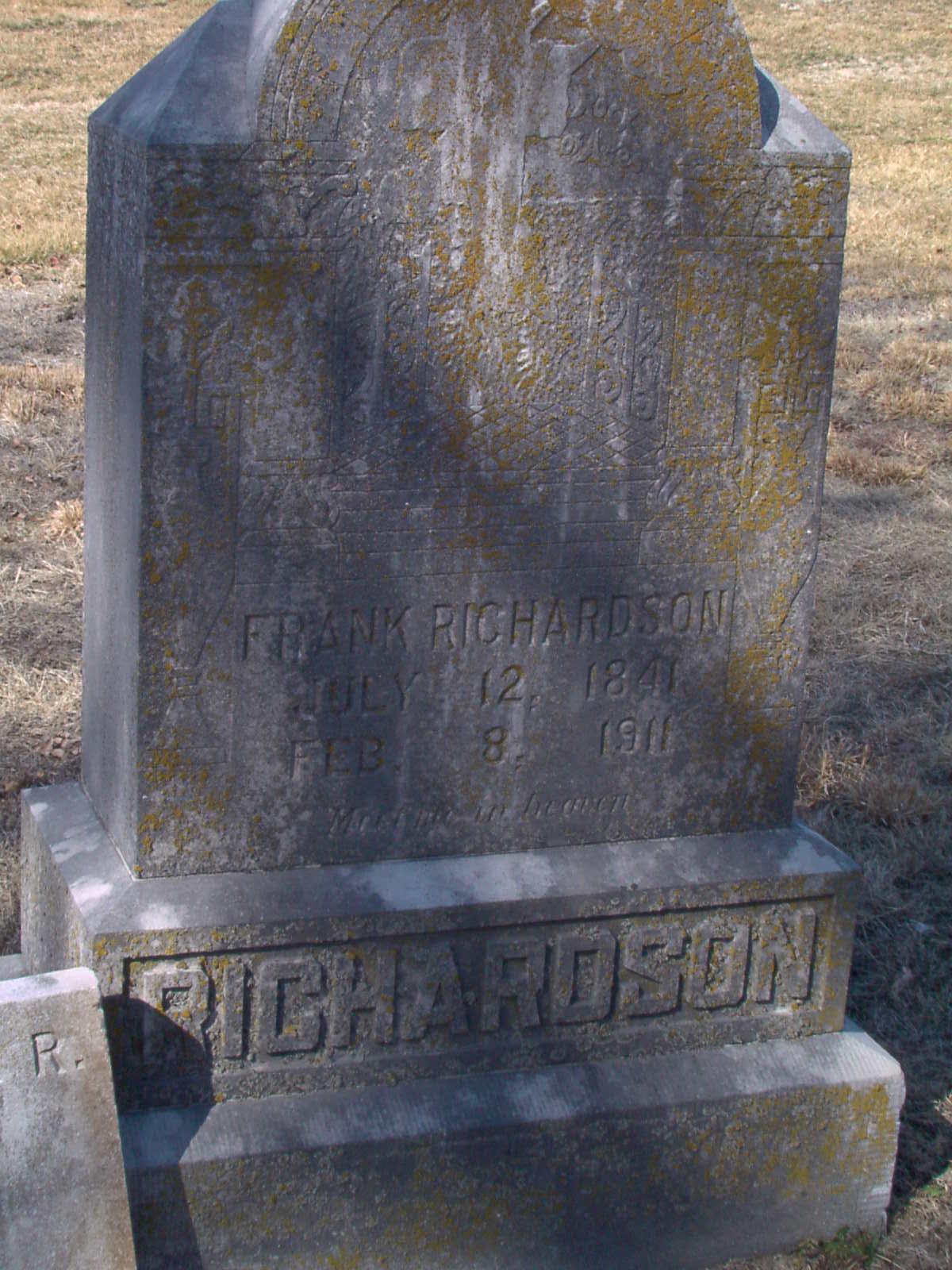 Inscription: "Rock Of Ages" "Meet Me In Heaven" - Research Note: He was a farmer and married. Father not known and mother's maiden name was Dunn. Mrs. Charles Adams was the informant on the death certificate. - Frank Richardson, age 52, married Edna Thomas, age 44, on July 6, 1894 in Barry Co., MO. Probably a second wife. | Death Certificate Phyllis Long Photo Jay Trace |