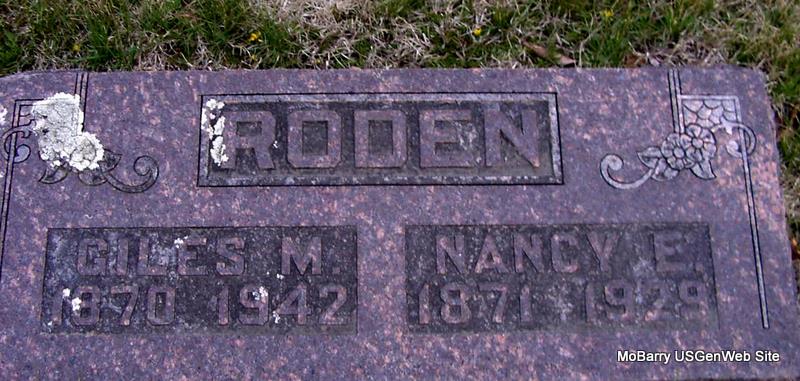 SSW: Nancy E. Roden - Research Note: Son of Greenberry Roden and Caroline Smith, both born TN. George Roden of Purdy, MO was the informant on the death certificate. Birth year given on DC was 1859 which is incorrect as it stated his age 72 which makes him born 1870. - Giles Roden, age 20, married Nancy Turner, age 22, on Feb. 17, 1889 in Crawford Co., AR. Giles Roden married Nancy Summers on Apr. 10, 1892 in Barry Co., MO. | Death Certificate AR Marriage Records MO Marriage Records Phyllis Long Photo Jay Trace |
